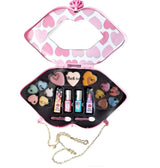 shadows, 3 blush, 5 lip gloss, 2 lip stick, 2 nail polish, 2 makeup applicator, 1 mirror and 1 chain.
