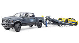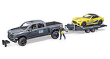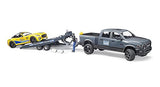 • Contains: Ram truck, driver with helmet, Bruder roadster and trailer