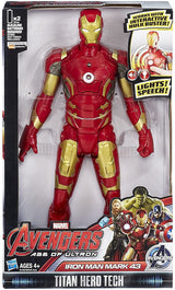 Details: All of their powers will be put to the test as the Avengers assemble to take on their greatest enemy: Ultron! Obsessed with mechanical perfection, Ultron will stop at nothing to control the world! Can the Avengers defeat him and save humanity? Enter the battle with Titan Hero Tech Iron Man! Titan Hero Tech Iron Man comes packed with Super Hero lights, sounds, and phrases! Iron Man says: • "Mark 43 online." • "Avengers, assemble!" • "Give up, Ultron." • "Now that's impressive." • "Cap, watch your back." • "Thor, I could use some lightning here." • "Jarvis, I need more power." • "Where's the Hulk Buster?!" • "It's just you and me Ultron." • "Captain America's briefed me on the situation." Plus, Titan Hero Tech figures work with Interactive Hulk Buster (sold separately). Interactive Hulk Buster recognizes and reacts to Titan Hero Tech figures, speaking unique phrases to each one! Copyright 2015 Marvel. Hasbro and all related terms are trademarks of Hasbro.