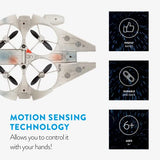 • A must-have for Star Wars fans - From a galaxy far, far away to your home! This incredible Star Wars quadcopter toy features motion sensing technology, which allows you to control it with your hands. Just turn it on, toss it into the air and watch the Millennium Falcon come to life and hover in place.