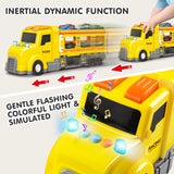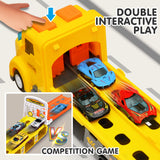 • MULTIFUNCTIONAL TRUCK TOY: The truck has early education , lights and music, inertial driving, catapult function ,competitive play, storage function,  etc. functions. Include 6 Stylish Metal Racing Cars and 12 road signs. This is an interesting toy set for your kids to develop their fine motor skills while having fun.