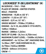 Details: The Lockheed P-38 LIGHTNING was a fast and heavily armed American long-range fighter aircraft of the Second World War. This unusual twin-engine aircraft had a nacelle with a pilot's cabin placed between two fuselages. The so-called "flying frame" provided very good performance, which translated into a long production period (which lasted from 1941 to 1945) and a huge number of victories by American pilots. The plane was decommissioned only in 1965. The P-38 LIGHTNING is released under the original license of the American defense company Lockheed Martin. Accurately reproduced in a 1:32 scale model, the plane consists of 545 COBI construction blocks. The model is covered with high-quality prints that do not wear off even during intense play. It is worth noting the characteristic markings and emblems refer to a historical aircraft bearing the number 208 and nose art of Pluto the dog. The plane has rotating propellers, folding landing gear, movable ailerons and an opening cabin in which you can place the well-designed pilot figure. The whole set is completed with a brick with the printed name of the set and the Lockheed Martin logo! This famous plane is the perfect gift idea for fans of aviation, history and technology. It will certainly satisfy even picky collectors and young people fascinated by blocks. Build history, piece by piece, with COBI!