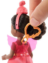 • This Chelsea dress-up doll wears a flamingo costume with a pink dress and translucent pink wings.