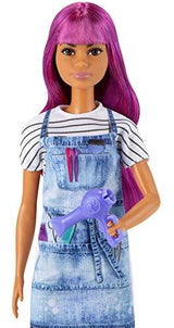 Details: Explore a world of hairstyling fun with the Barbie salon stylist doll! When a girl plays with Barbie, she imagines everything she can become, and if you love cutting and styling hair, you can be a salon stylist! The Barbie salon stylist doll (12-in/30.40-cm) wears a cute striped tee and a tie-dye smock, comfy shoes and has long purple hair. She comes with a blow dryer and brush (clips let the doll hold them) plus two hair clips. Kids will love the endless possibilities for creative expression and storytelling fun. Doll cannot stand alone. Colors and decorations may vary. Makes a great gift for ages 3 years old and up.