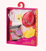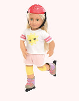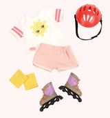 Dominate the sidewalk in style with the Roll With It rollerblade outfit for 18-inch dolls! Made for adventure, this athletic ensemble will have your dolls ready for summer fun. With our generation's focus on conservation and exploration, this outfit is perfect for teaching important values while having a blast. Includes fashionable accessories for a complete look. Let the good times roll!