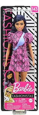 • Barbie doll wears a pink and black snakeskin-print dress with puffy sleeves.
