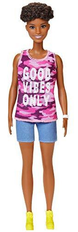 • Barbie doll has a smaller bust than the original body and wears a pink camo top with "good vibes only" graphic paired with denim shorts.