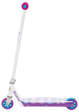 Details: The legendary scooters that started it all. Shred the pavement, bust out big tricks, or just cruise around town in style. With innovative design, quality construction and cool features, these are the scooters that sparked a revolution. Become the life of the party with the all-new, light-up Party Pop. Step on the deck to fire up the pulsating multi-color lights, then keep the fun rolling as you take this light show on wheels on an kick powered tour through the neighborhood. With a steel frame, handlebar and fork and urethane wheels- this scooter not only looks cool but is good quality. Some assembly required. Powered by two CR2032 lithium batteries (included and replaceable). Recommended for ages 6 and older and will support a rider up to 143 pounds. Read and understand the enclosed owner's manual before riding. The buyer and rider of all Razor scooters are responsible for knowing and obeying all local, state and federal regulations regarding the riding and use of scooters.